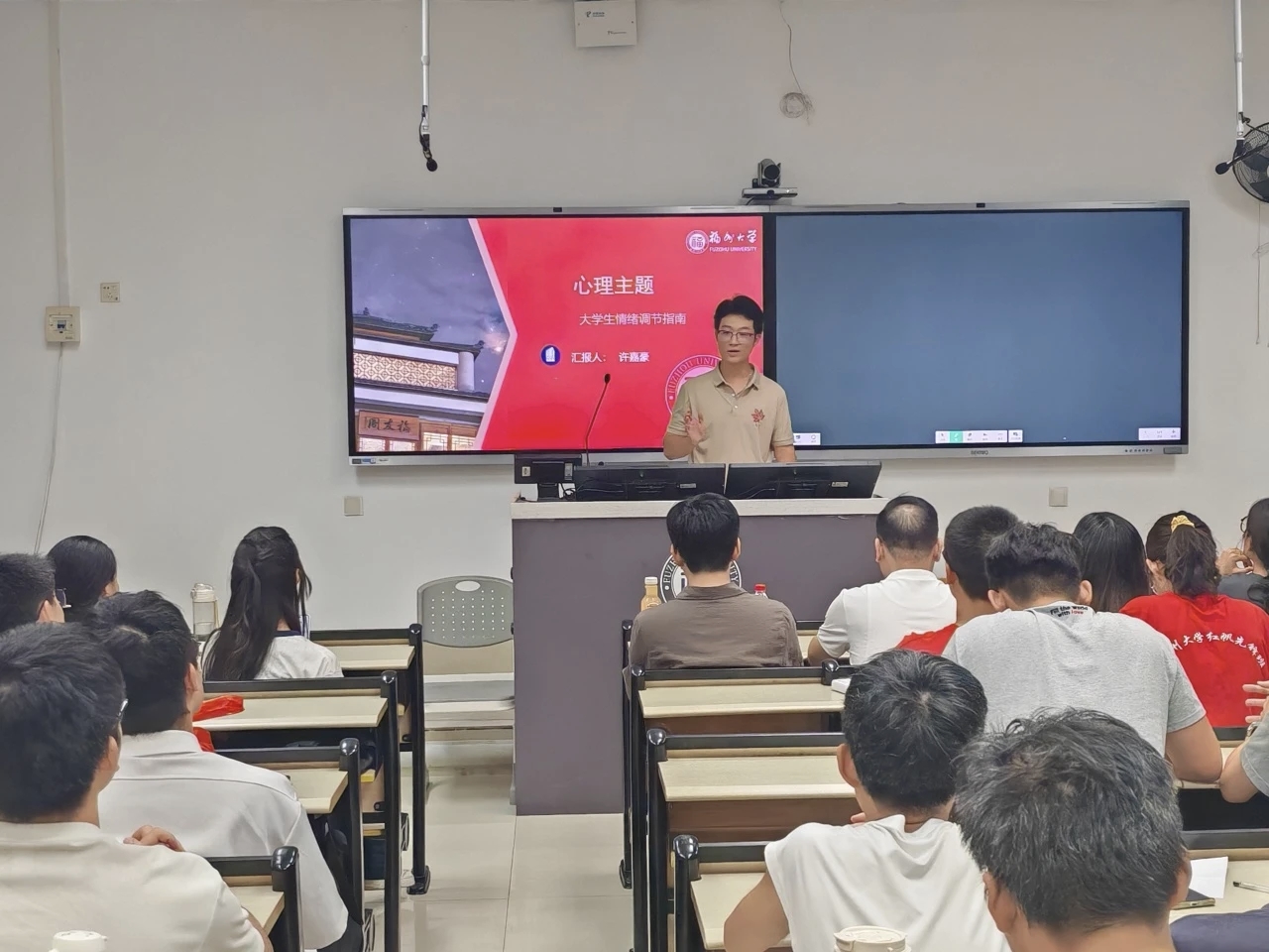 心理委员许嘉豪首先为同学们播放了轻松解压的短视频。他围绕生活中常见的负面情绪展开分享,结合自己的亲身经历现身说法。在和同学们的互动交流中,他还提出一系列适合同学们的情绪调节方法,如加强自我肯定、及时适当疏导、调整生理作息等。