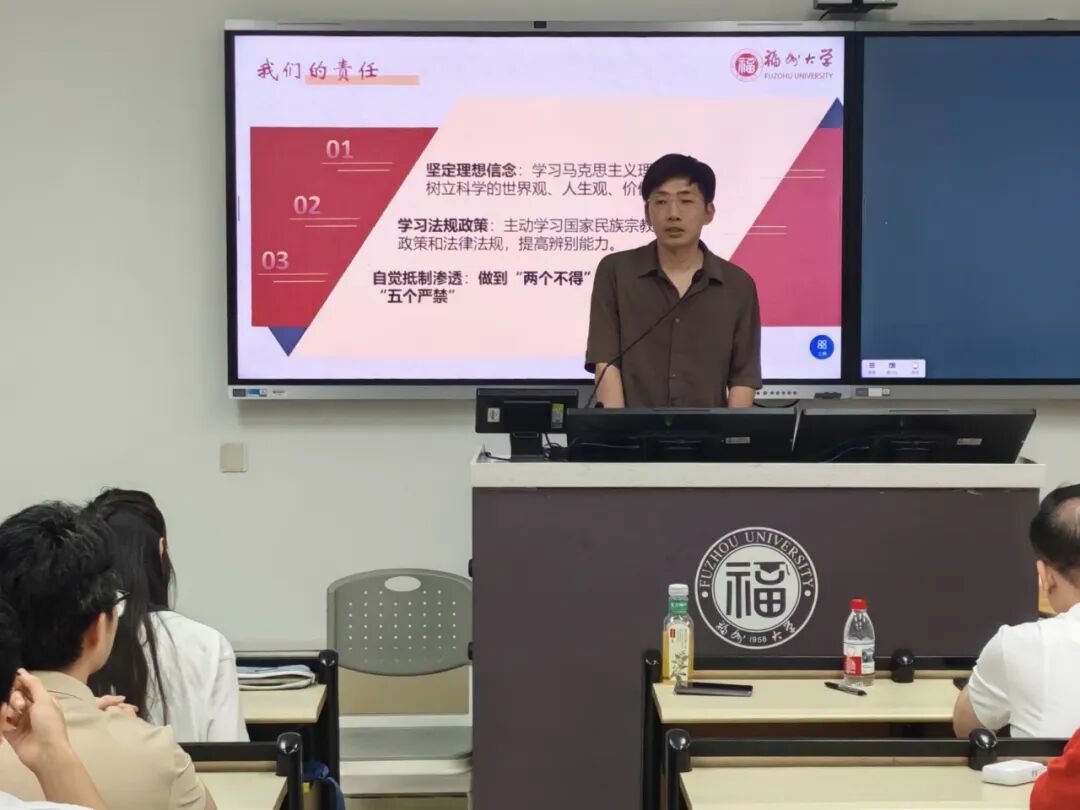 组织委员池善涵首先阐释了宗教的核心内涵,随后围绕“两个不得”、“五个严禁”核心要求展开讲解,结合案例深入介绍我国宗教信仰自由政策的法律基础与宗教法规的重要意义。通过剖析违反宗教法规的具体后果,他号召青年学子坚定理想信念、主动学习政策法规,自觉抵御境外势力利用宗教进行的文化渗透活动 。
