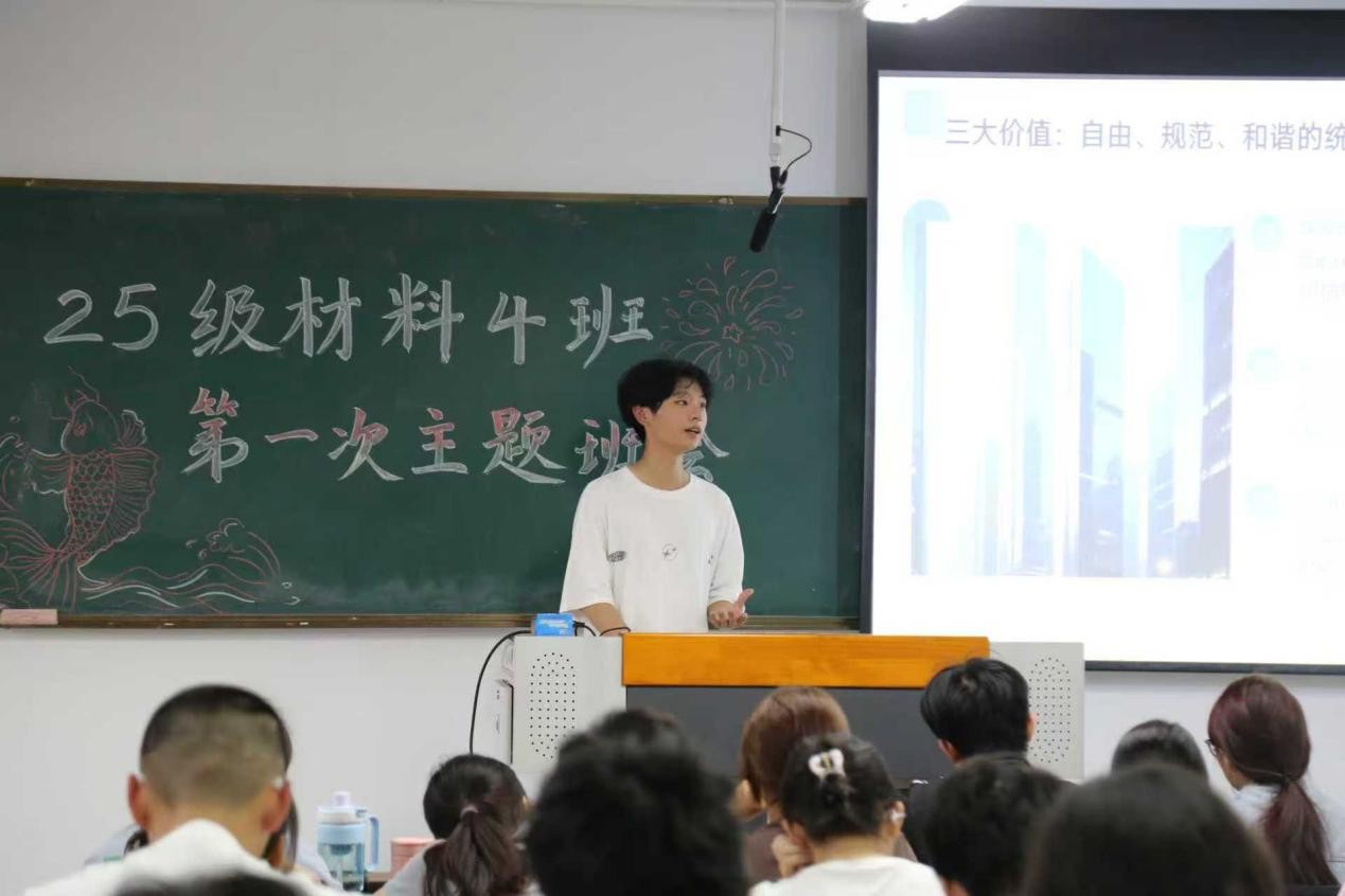 时政教育环节,副班长陈奕天带领同学们学习党的二十届四中全会公报要点,重点解读深化改革开放、推进中国式现代化等重要部署。同学们通过探讨材料专业学子在发展新质生产力、实现科技自立自强中的责任与定位,进一步深化了个人成长与国家发展的认识。