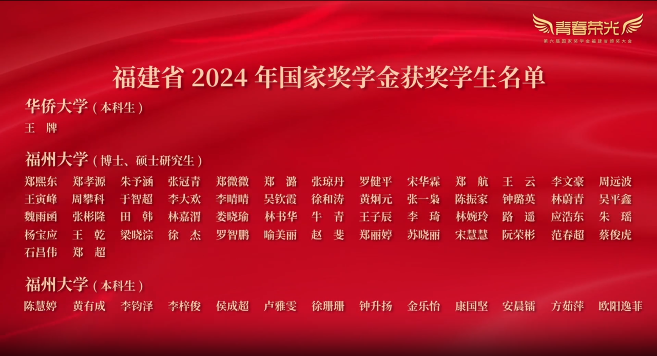 作为福大学子,看到学长学姐登台领奖、师生参演情景励志剧《世界赠予我的》,我倍感自豪。获奖学子中,有深耕科研的探索者,有坚守热爱的追光者,他们的故事诠释了奋斗的意义。张彦部长“胸怀国之大者”的勉励,更让我明确了青年担当。我将以榜样为镜,在专业学习中深耕不辍,让青春在强国建设新征程中绽放绚丽光彩。