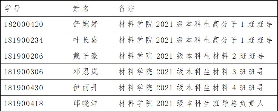 根据《成人影片 本科新生班导选拔及管理办法》文件精神,经学生本人申请、学院同意,同意推选戴子豪等6名学生申请成人影片 2021届新生班导,现将具体名单公示如下。