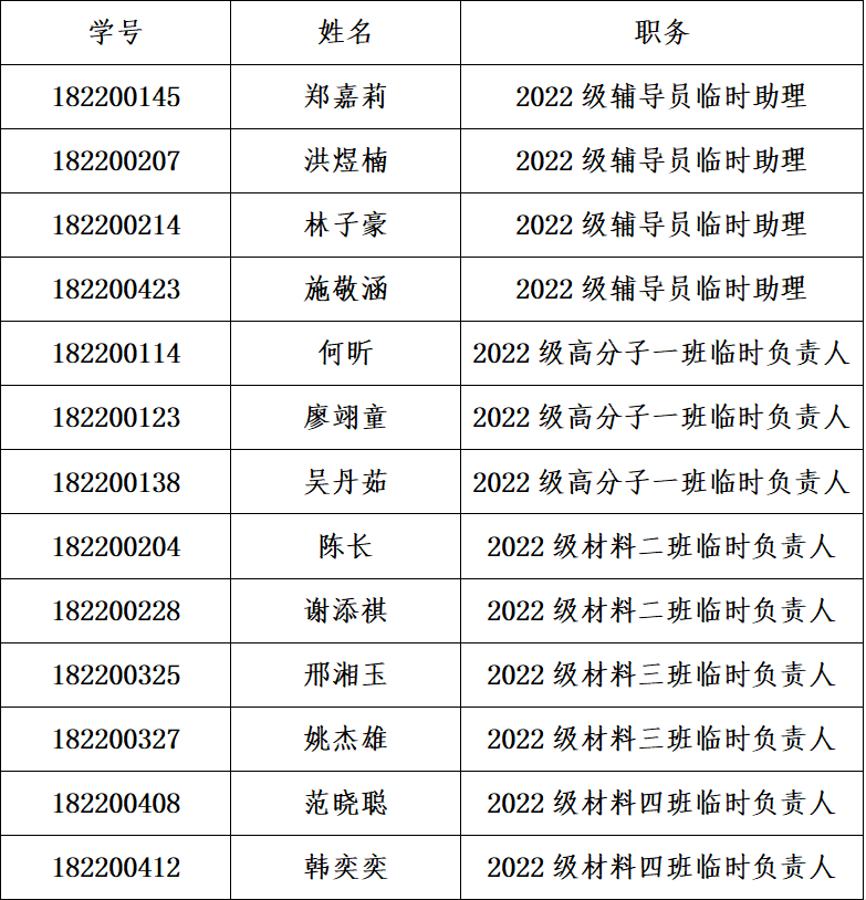 经学生本人申请、辅导员及各班导班助面试审核,同意推选郑嘉莉等4名同学为成人影片 2022级新生辅导员临时助理,推选何昕等9名同学为2022级新生班级临时负责人。现将具体名单公示如下: