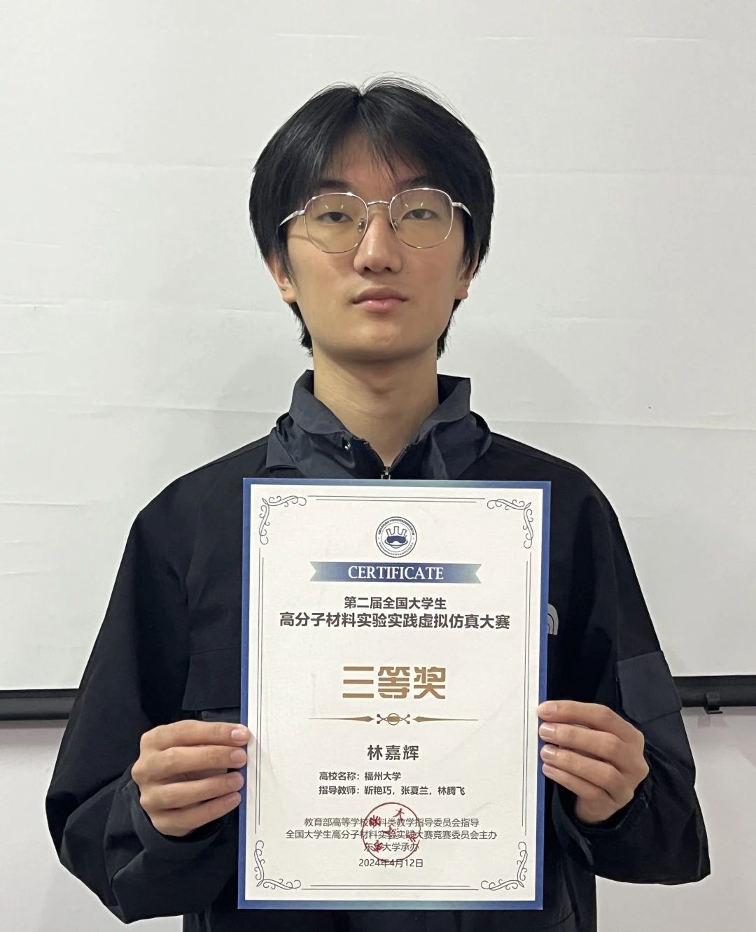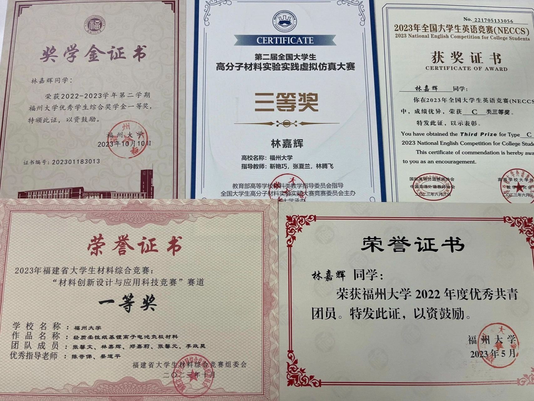 一枝独秀不是春,在精进学业的同时,全方面发展也是他所注重的。在思想方面,他认真学习党的理论,紧跟党的步伐,于2023年12月成为一名中共预备党员,并获评2023-2024学年成人影片 三好学生。在学科竞赛方面,他坚持学以致用,积极参与,获得了2023年福建省大学生材料综合竞赛一等奖、“挑战杯”成人影片 大学生创业计划竞赛银奖、2024年福建省大学生材料综合竞赛二等奖、第二届全国大学生高分子材料实验实践虚拟仿真大赛三等荣誉。在社会实践方面,他热心于公益,积极参加暑期三下乡等各类志愿活动,累计志愿时长460余小时,获评校星级志愿者。
