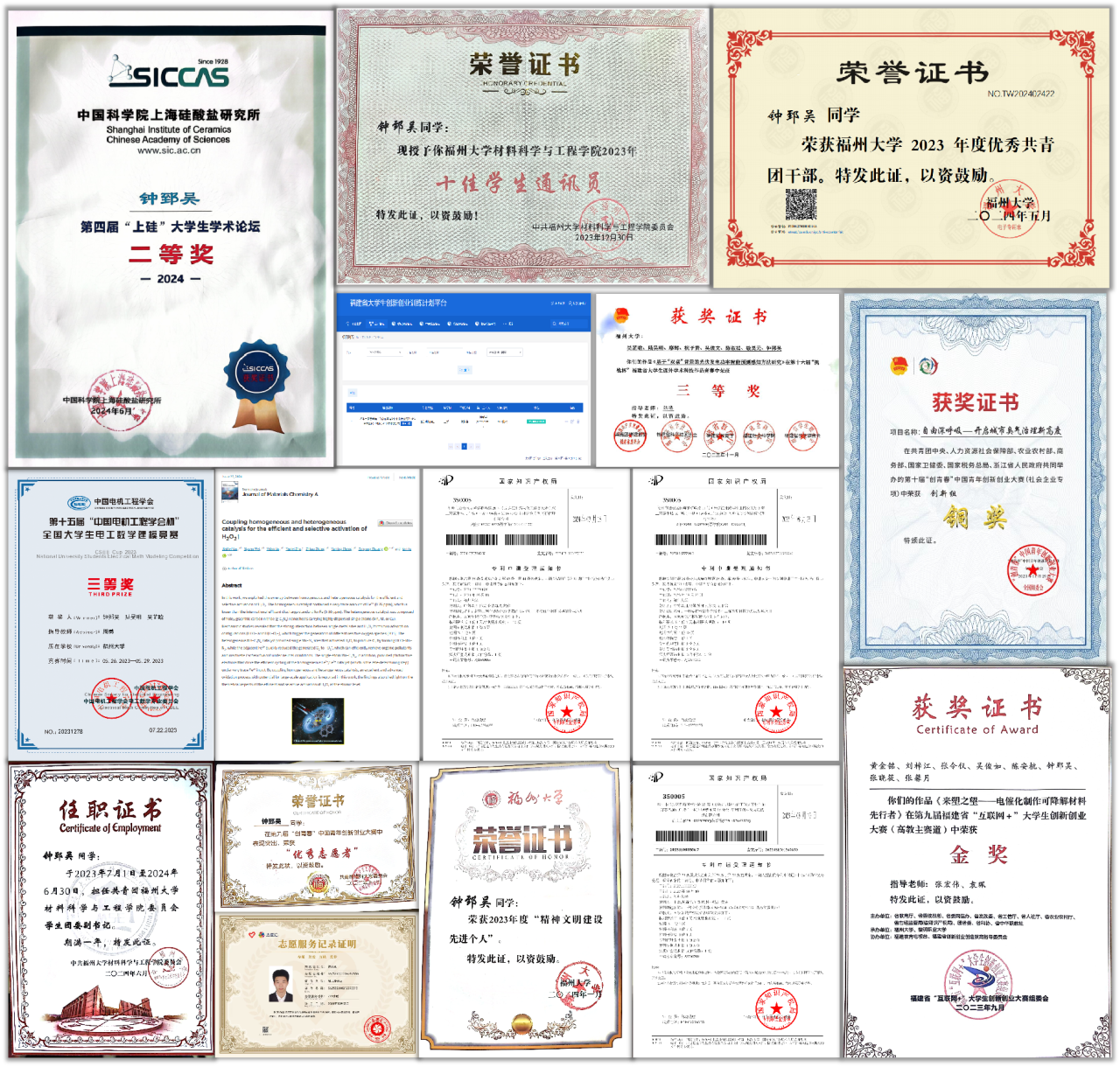 在学术研究领域,钟郅吴同学展现出了卓越的创新能力和实践技能。他在“创青春”、大学生创新大赛等竞赛中屡获佳绩,这些成绩不仅验证了他的学术实力,也反映了他对材料科学领域的深刻理解和独到见解。至今,他已成功申请了三项国家发明专利,这些成就不仅丰富了他的学术履历,更是他以学术成就回馈社会的有力证明。