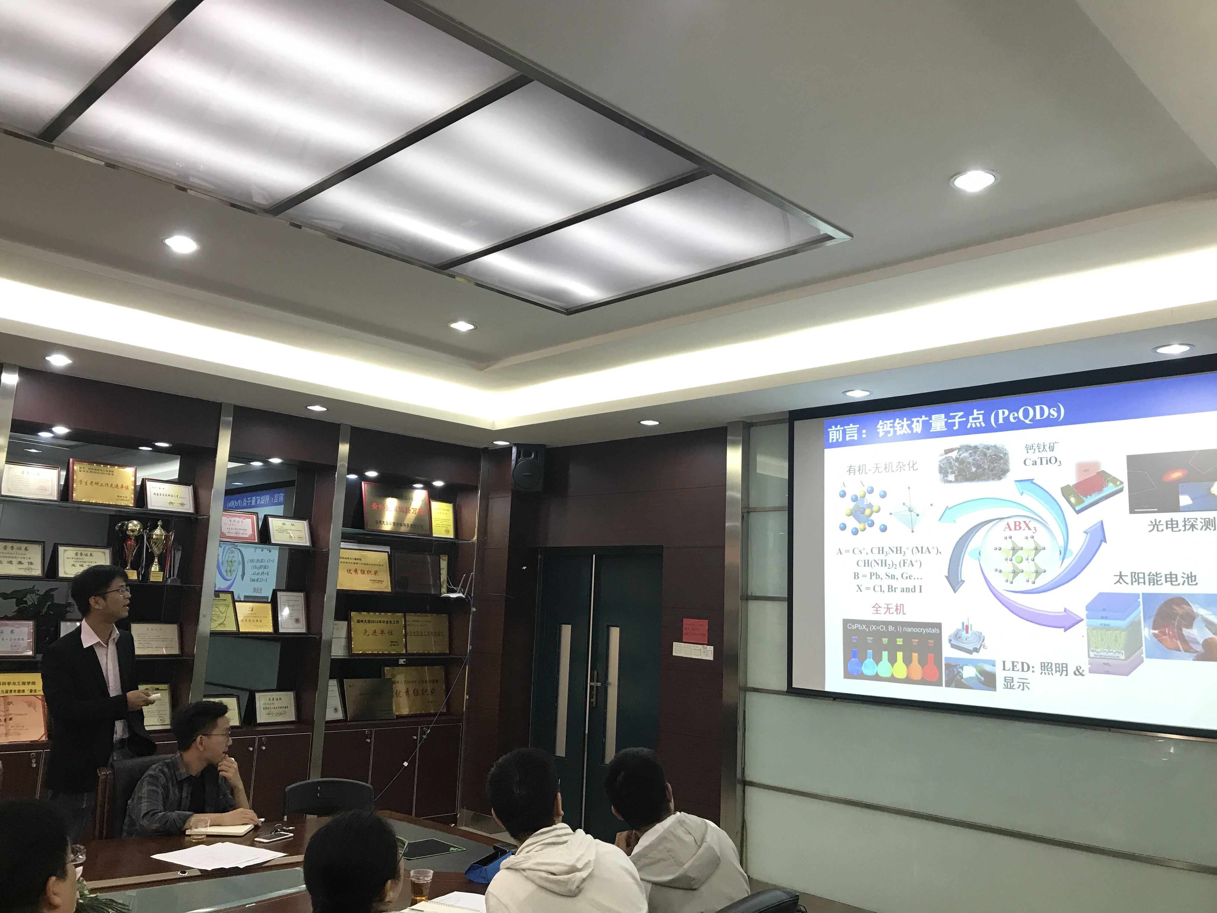 报告中,郑伟副研究员提出一种辐射能量传递上转换新机制,利用稀土纳米晶到CsPbX3量子点的辐射能量传递,首次实现了CsPbX3量子点在低功率半导体激光器激发下的全光谱高效上转换发光,并通过剪裁稀土离子的荧光寿命将CsPbX3激子的表观荧光寿命从ns量级提升到ms量级;并结合稀土和钙钛矿量子点的发光优点,提供了一种上转换和长余辉发光调控的新策略,也为稀土/钙钛矿量子点新型复合发光材料在光电领域的应用开辟了新的方向。报告尾声,郑伟副研究员与成人影片 师生就相关问题进行深入交流和探讨。
