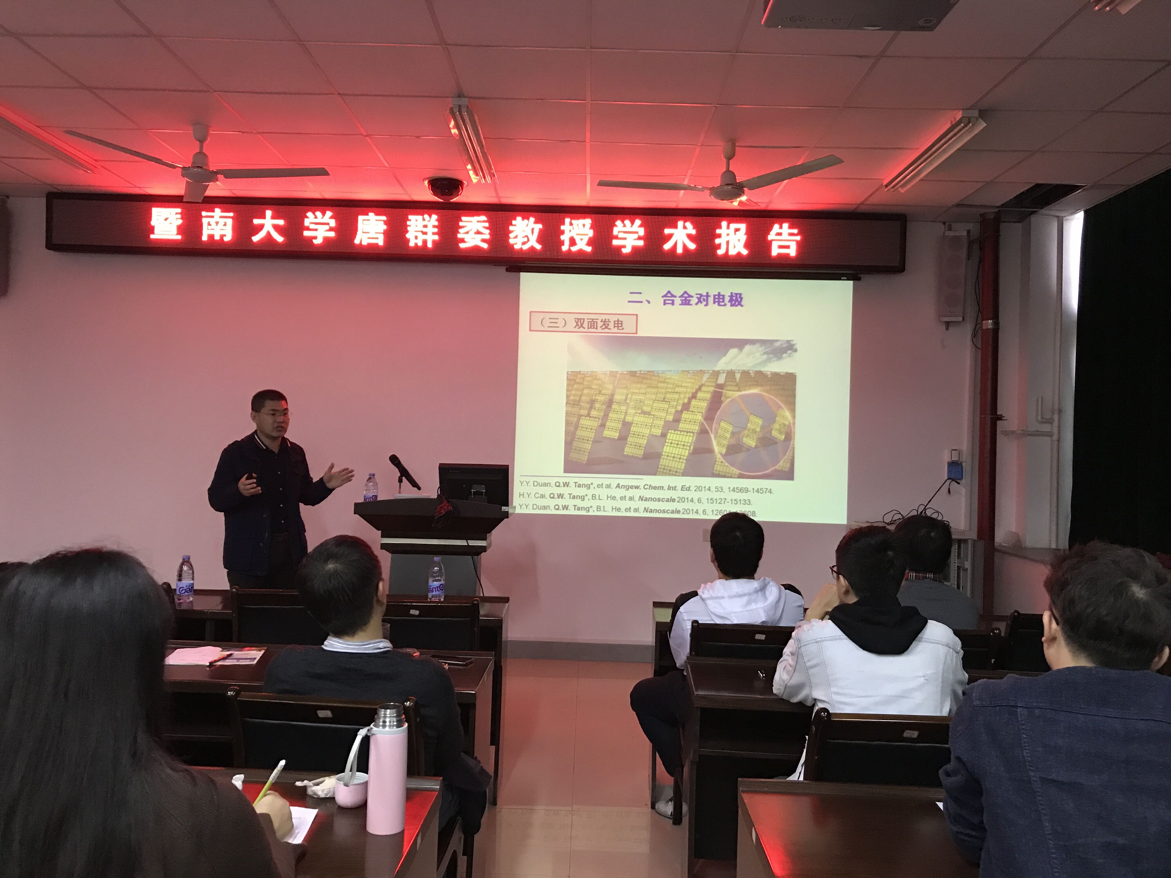 11月14日上午,暨南大学唐群委教授莅临材料科学楼404为成人影片 师生带来一场题为“高效率染料敏化太阳能电池和无机钙钛矿太阳能电池”的学术报告。成人影片 青年教师和研究生积极听取了报告,报告由“闽江学者”特聘教授肖方兴老师主持。