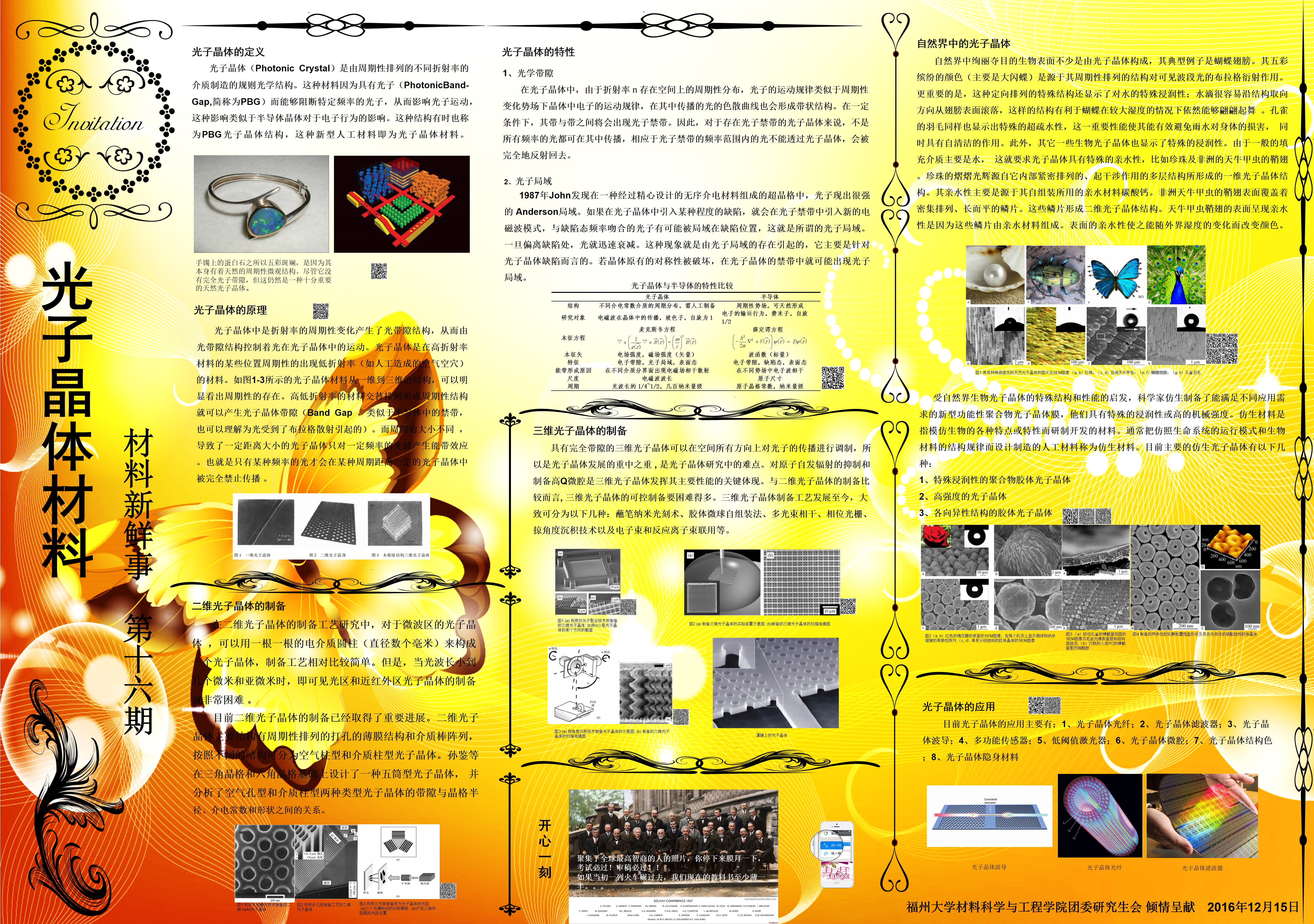 12月18日,由成人影片 研究生会主办的 “材料新鲜事”科普海报在成人影片 实验楼一楼如期展示。“材料新鲜事”结合当前最新的研究动态,向同学们科普光子晶体的相关知识概念和一些最新的新闻报道,本期主角为光子晶体。海报刚刚张贴就迎来同学和老师们的围观,展示得到了良好的回应。