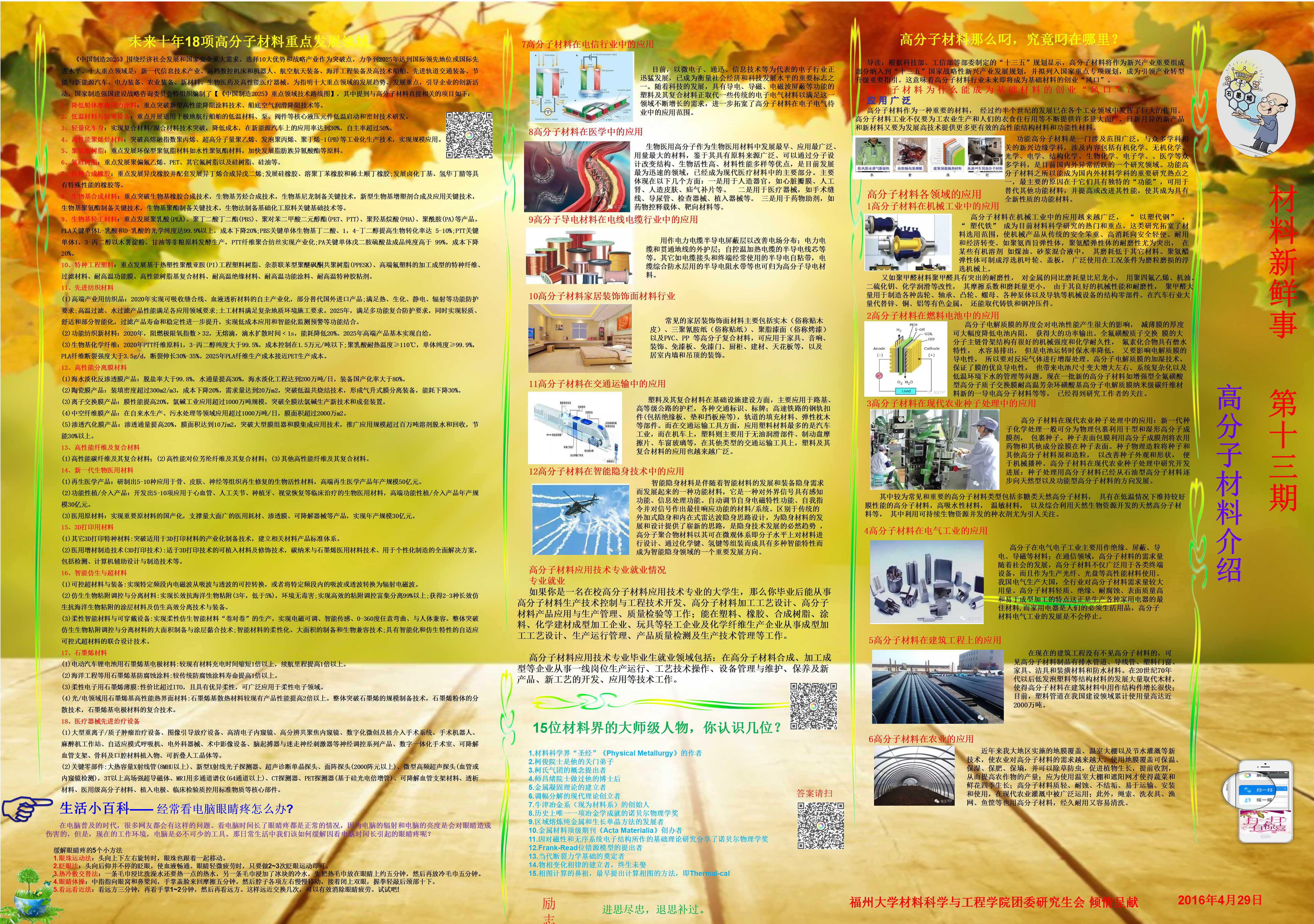 4月29日,材料新鲜事第十三期如期开展,材料新鲜事由成人影片 研究生会创办,以海报的形式向大家展示材料领域科技的一些最前沿的一些报道;每一期的材料新鲜事都会给大家带来科研“时事”——在各个材料领域,取得的最新进展。本期以高分子材料为主题,介绍了高分子材料的应用领域和未来十年高分子材料的重点发展领域。