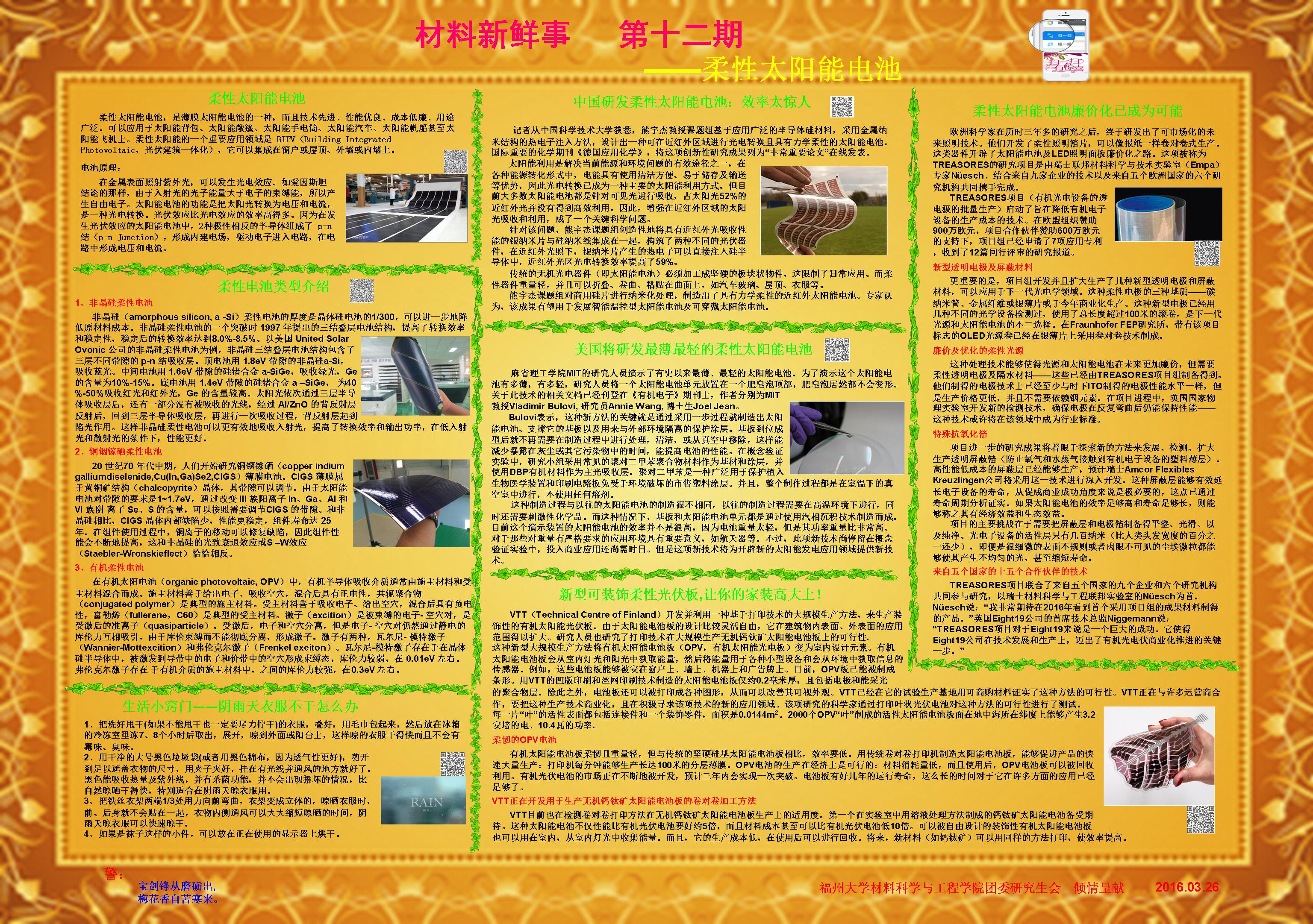 3月26日,由成人影片 研究生会主办的 “材料新鲜事”科普海报第十二期如期地向大家展示,这期主要讲的是柔性太阳能电池,结合当前最新的研究动态,向同学们科普柔性太阳能电池的相关知识概念和一些最新的新闻报道。海报刚贴出来就迎来同学和老师们的围观,得到了良好的回应。通过该系列活动的开展,开拓了同学们的知识面,也激发了同学们的创新性,营造了良好的学术科研氛围。