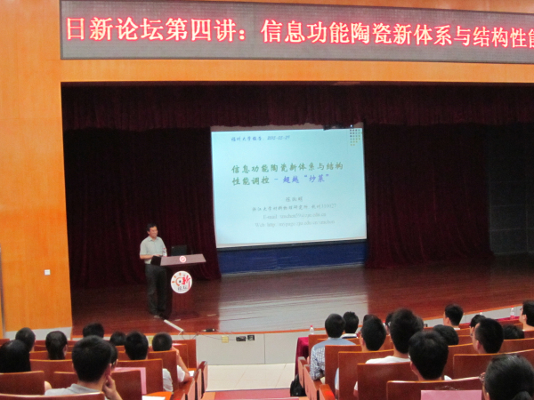 本次讲座的主题为“信息功能陶瓷新体系与结构性能调控”。陈湘明教授立足自己的研究成果,重点介绍了微波介电陶瓷、铁电陶瓷等信息功能陶瓷取得的新的进展。陈湘明教授向大家展示了科研过程中严谨的思维对课题的提出以及创新点的发现所起的重要作用。“如果还有人说我们材料专业无外乎“抄菜”,那么我们可以理直气壮地回应对方,我们炒的菜是有菜谱的,是有章可循的。”他还与现场的各位师生进行了互动,让大家加深了对此问题的理解。陈湘明教授的演讲诙谐、幽默,在讲座中,他旁征博引、融贯中西,让在场的听众享受了一次精神大餐,赢得在场每位观众的热烈掌声。至此,第四期日新讲坛取得圆满成功。