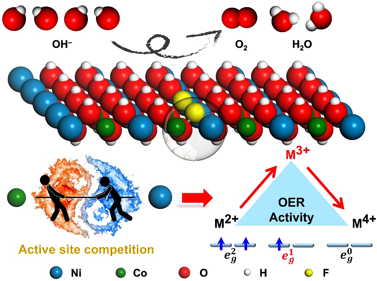 近日,成人影片 、新能源材料与工程研究院在电解水析氧催化剂研究方面取得新进展,相关成果以“Ni and Co Active Site Transition and Competition in Fluorine-Doped NiCo(OH)2 LDH Electrocatalysts for Oxygen Evolution Reaction”为题发表于Top期刊《Small》(JCR 1区,IF=13.3)。