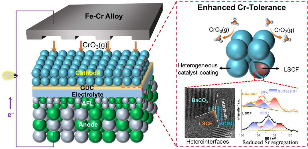 该论文报道了一种异质催化剂涂层修饰的SOFC阴极, 通过界面工程策略调控材料表面的应力和氧空位缺陷,提升阴极的电化学催化活性、抑制锶离子的表面析出及增强抗铬中毒能力,为设计和开发高活性抗铬阴极提供了新的思路。