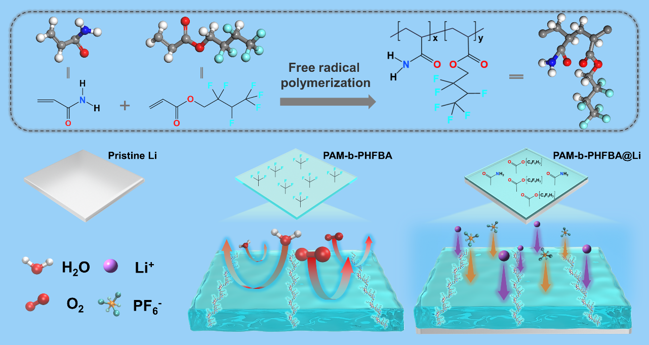 严重的枝晶形成和与副反应相关的安全隐患阻碍了锂金属电池的实际应用。这项工作报道了一种基于物理和化学特性的分子定制策略,采用丙烯酰胺(AM)与丙烯酸六氟丁酯(HFBA)分子共聚物作为锂金属的人工固态电解质界面(ASEI),实现循环过程中的动态界面保护。酰胺基团作为刚性单元,六氟丁基作为柔性单元,使共聚物具有优异的机械性能。协同丰富的C─F键实现优异的防水性和阻氧性,并具有良好的电解质亲和力。酯基和酰胺基团作为Li+和PF6−的两亲位点,调节界面处的离子通量,实现无枝晶锂沉积。在循环过程中,动态演变为有机-无机复合SEI以保护锂金属,防止过度的电解质消耗。该共聚物修饰的锂金属负极在1 mA cm-2和2 mA cm-2下分别实现了1500小时和950小时的稳定循环。它与LiNi0.8Co0.1Mn0.1O2和LiFePO4正极匹配使用时表现出卓越性能。该研究介绍了一种在分子水平上设计聚合物以优化锂金属界面物理性质/化学活性的新方法。