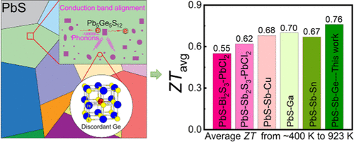 研究团队发现,在Sb掺杂的N型PbS中,通过合金化GeS,发生Ge价态歧化反应,生成了Pb5Ge5S12第二相。Pb5Ge5S12的生成引入了S空位,提高了载流子浓度和电导率,优化了电输运性能。通过对Pb5Ge5S12半导体价带和导带的测量发现,其与PbS基体具有接近的导带位置,保证了载流子较高的迁移率。相较于在P型PbX中通常采用的价带对齐优化策略,文章创新性地实现了N型PbX体系的导带对齐。另一方面,由点缺陷(固溶的偏心Ge原子、掺杂剂Sb,以及S空位)、纳米尺度Ge和中尺度Pb5Ge5S12共同构成了多尺度分级结构,能够有效散射声子,降低了材料晶格热导率。最终实现了电、热输运性能的同时优化,获得了0.76的ZTavg,这是目前N型PbS热电材料报道的最高值。同时,首次合成了Pb5Ge5S12半导体的玻璃态和多晶材料,并研究了其基本的物理性能。