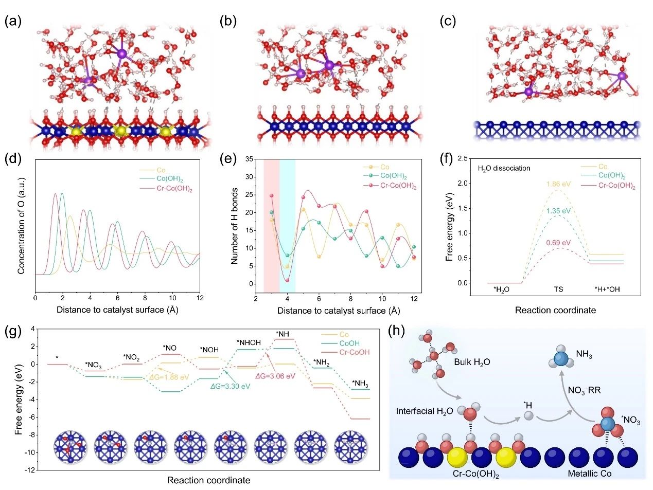 氨(NH3)作为一种清洁氢源,同时也是化肥、化工生产的主要原料,然而其工业合成主要依赖于高能耗、高碳排放的Haber-Bosch技术。电催化硝酸根还原(NO3-RR)可以利用绿色电能同时实现清洁的氨合成和工业废水处理,实现变废为宝。钴基催化剂由于其适当的NO3-吸附能力和快速的NO2-去除能力,被认为是一种极具潜力的电化学合成氨催化剂。然而,钴基催化剂在电催化NO3-RR过程中通常会发生重构,重构过程不可逆且难以调控。且电催化NO3-RR涉及多步质子耦合电子反应过程,其中氢化步骤需要持续供应活性氢(*H),目前界面氢键对NO3-RR性能的影响尚未得到充分解释。因此,亟需进一步探索钴基催化剂的动态重构机制以及界面氢键调控对NO3-RR电化学加氢合成氨性能的影响。