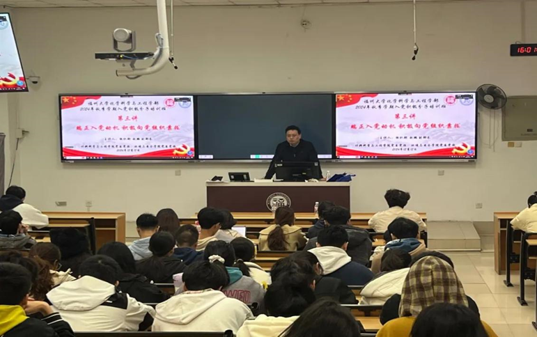 12月12日下午,赵鹏副部长以“端正入党动机,积极向党组织看齐”为主题进行专题讲座。赵副部长以现实案例为切入点,引出“什么是正确的入党动机”、“为什么要端正入党动机”、“怎样端正入党动机”,勉励在场的学员们不仅要在组织上入党,更要从思想上入党。同时,他通过介绍中国共产党的基本情况,进一步加深学员们对中国共产党的认识,鼓励学员们积极向党组织靠拢,争取早日成为一名优秀的共产党员,为党和国家的发展贡献自己的力量。