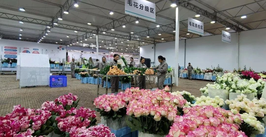云南丽江现代花卉产业园内,工人正在分类整理鲜花。